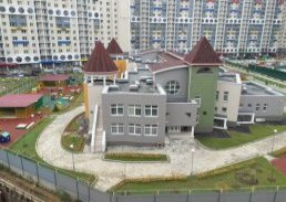 Здание детсада, рассчитанное на 180 воспитанников, возведено по монолитной технологии с использованием инновационных фасадных систем. Группы имеют нестандартные планировочные решения, максимальное освещение достигается за счет встроенных в кровлю оконных проемов в некоторых помещениях мансарды.